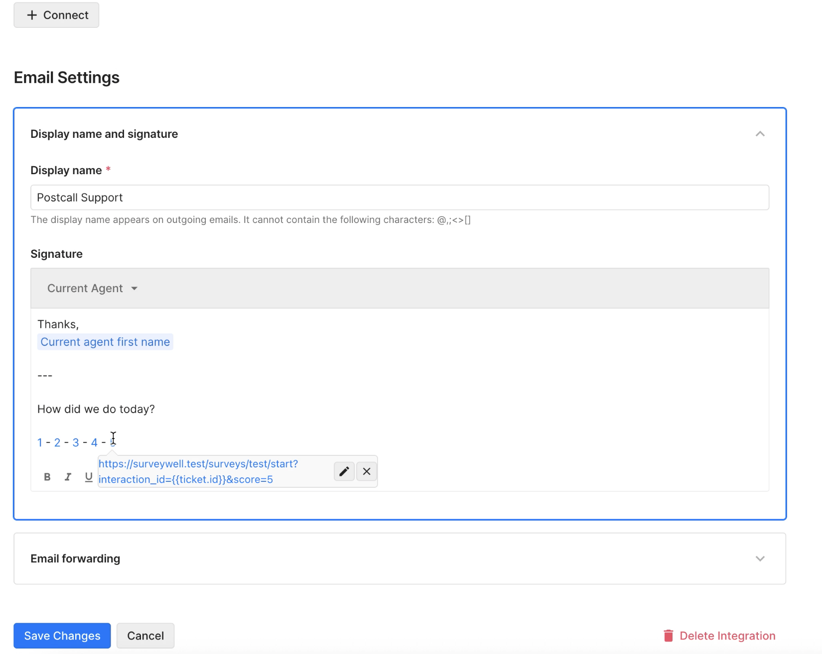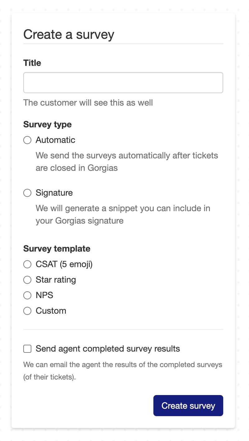 Edit Survey type, look and feel and so on, then under "Generate signature", copy the survey. This will be added to Gorgias.